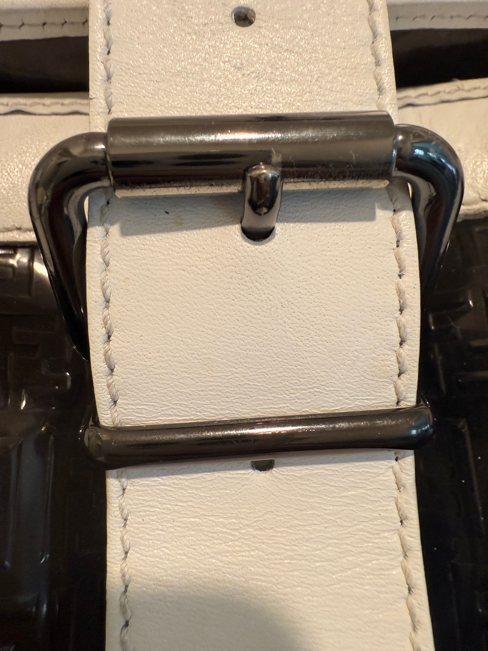 Fantastic Fendi shopper in brown, see through PVC with the FF motif, and beautiful white leather trim and piping and a chunky silver buckle. Unfortunately its pouch is missing, but the “leash” is intact and can hold your keys or another pouch of your choice. Very unique and hard to find shopper - would be a great beach bag or work/school tote! Bonus pouch included, cuz you’re awesome!!